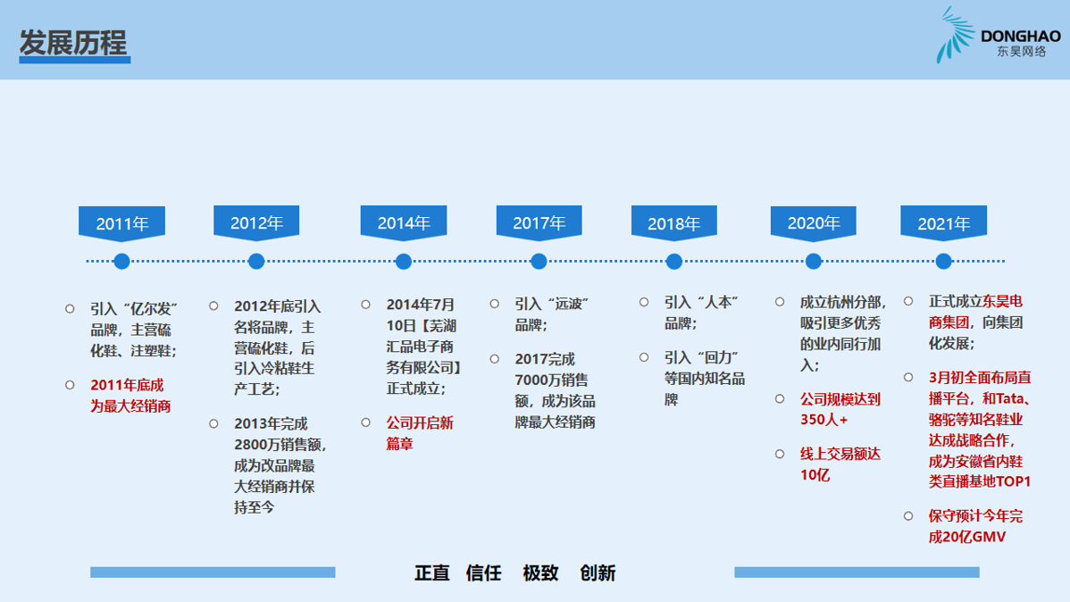 蕪湖東昊網絡科技有限公司,成立于 2014 年,是一家以互聯網平臺銷售為核心的電子商務運營商,公司成立以來,始終專注于休閑運動鞋的互聯網銷售業(yè)務,產品線覆蓋硫化鞋、注塑鞋、冷粘鞋,在互聯網二級類目單品牌排名前三,綜合成績排名TOP1;